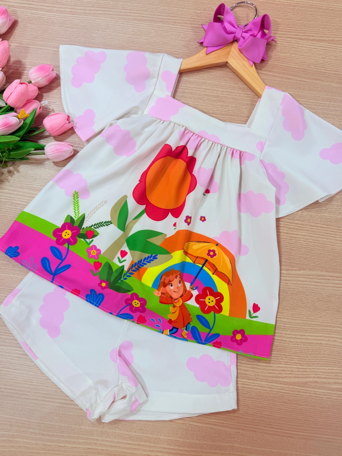 | Medidas: 4 anos - Blusa 62cm busto / 44cm comprimento Short 54cm largura / 25cm comprimento 6 anos - Blusa 68cm busto / 49cm comprimento Short 56cm largura / 26cm comprimento 8 anos - Blusa 74cm busto / 50cm comprimento Short 62cm largura / 30cm comprimento 10 anos - Blusa 82cm busto / 51cm comprimento Short 68cm largura / 31cm comprimento