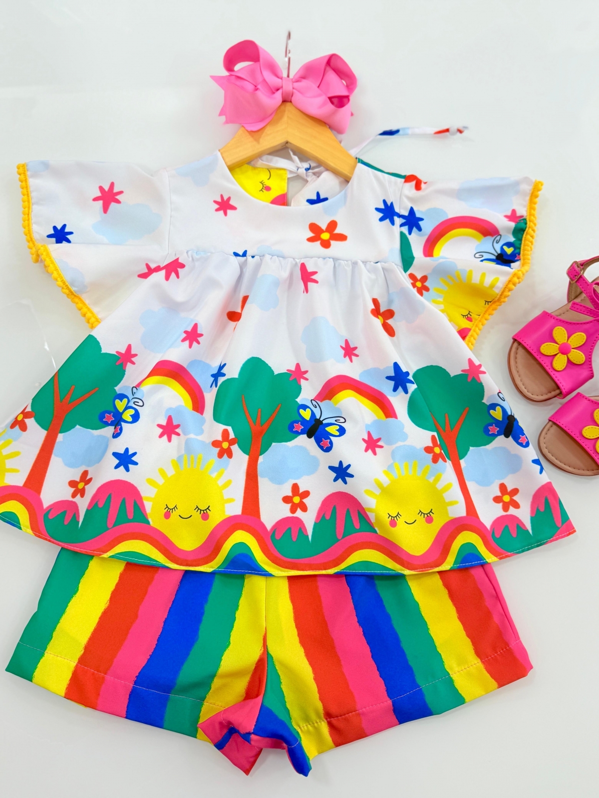 | Batinha + short Conjunto em Tecido Soft Crepe Microfibra, super macio, não amarrota detalhe de pompom na manga, shor com bolso medidas BLUSA TAM 2: BUSTO FRENTE 26 CM | ALTURA 39 CM TAM 4: BUSTO FRENTE 29 CM | ALTURA 40 CM TAM 6: BUSTO FRENTE 30 CM | ALTURA 42 CM TAM 8: BUSTO FRENTE 33 CM | ALTURA 45 CM TAM 10: BUSTO FRENTE 34 CM | ALTURA 47 CM TAM 12: BUSTO FRENTE 36 CM | ALTURA 49 CM SHORTS TAM 2: CINTURA FRENTE (ELASTICO sem esticar ) 22 CM | ALTURA 24 CM TAM 4: CINTURA FRENTE (ELASTICO sem esticar) 24 CM | ALTURA 25 CM TAM 6: CINTURA FRENTE (ELASTICO sem esticar) 26 CM | ALTURA 27 CM TAM 8: CINTURA FRENTE (ELASTICO sem esticar) 28 CM | ALTURA 30 CM TAM 10: CINTURA FRENTE (ELASTICO sem esticar) 30 CM | ALTURA 31 CM TAM 12: CINTURA FRENTE (ELASTICO sem esticar) 32 CM | ALTURA 32 CM (NÃO FAZEMOS TROCA E NÃO EMBALAMOS PARA PRESENTE AS PEÇAS QUE ESTÃO NA PROMOÇÃO) |